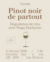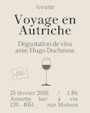 Dégustation de vin, repas gastronomique, humour, spectacle, voici les prochains événements que Annette vous prépare.